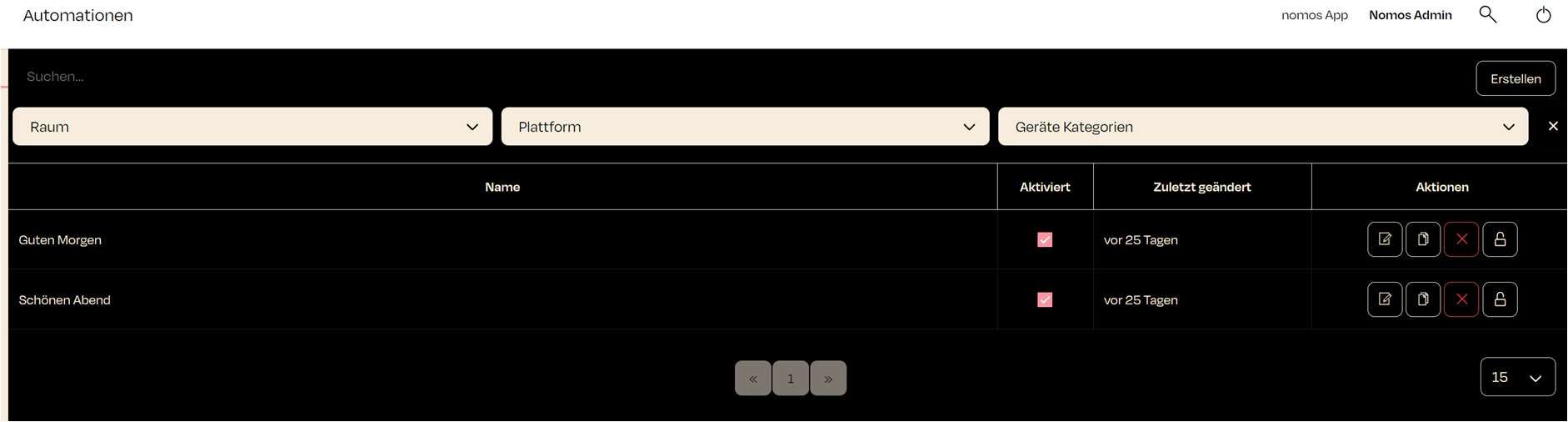 Cette vue montre un aperçu de toutes les automatisations créées dans le contrôleur nomos. Chaque automatisation contient les informations suivantes :