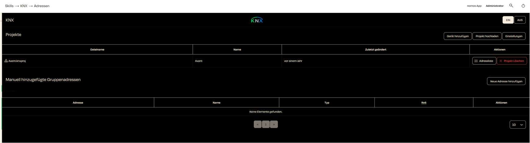 Lorsque vous cliquez sur « Gérer les adresses » dans le menu KNX, le tableau de bord suivant apparaît. Il offre un aperçu de tous les projets KNX actuels et des adresses de groupes ajoutées manuellement.