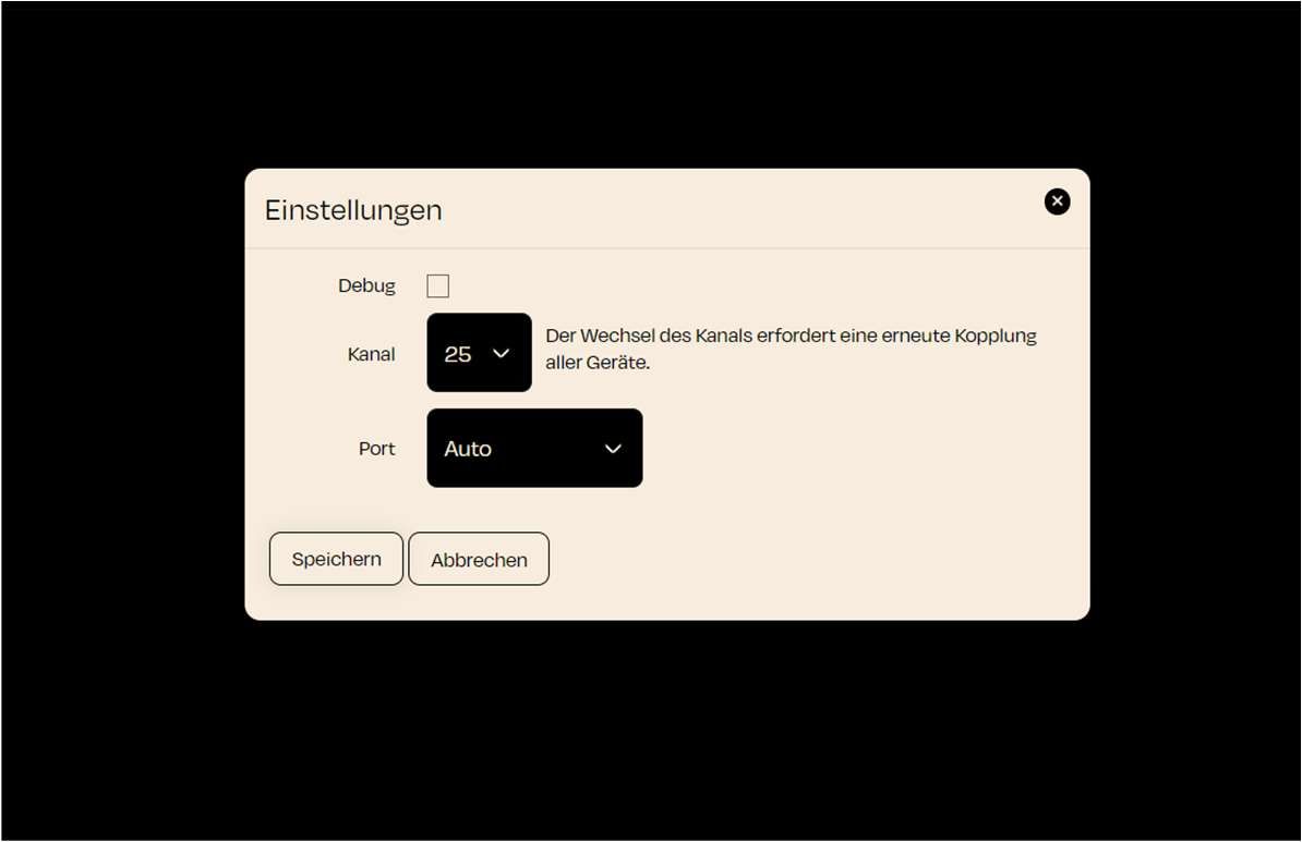 <figure><img src="https://content.gitbook.com/content/iBbcEfkKVwJ4QJklDp1X/blobs/VLSTp8popkWVBeUhauzK/Zigbee%20Einstellungen.jpg" alt="" width="563"><figcaption></figcaption></figure>