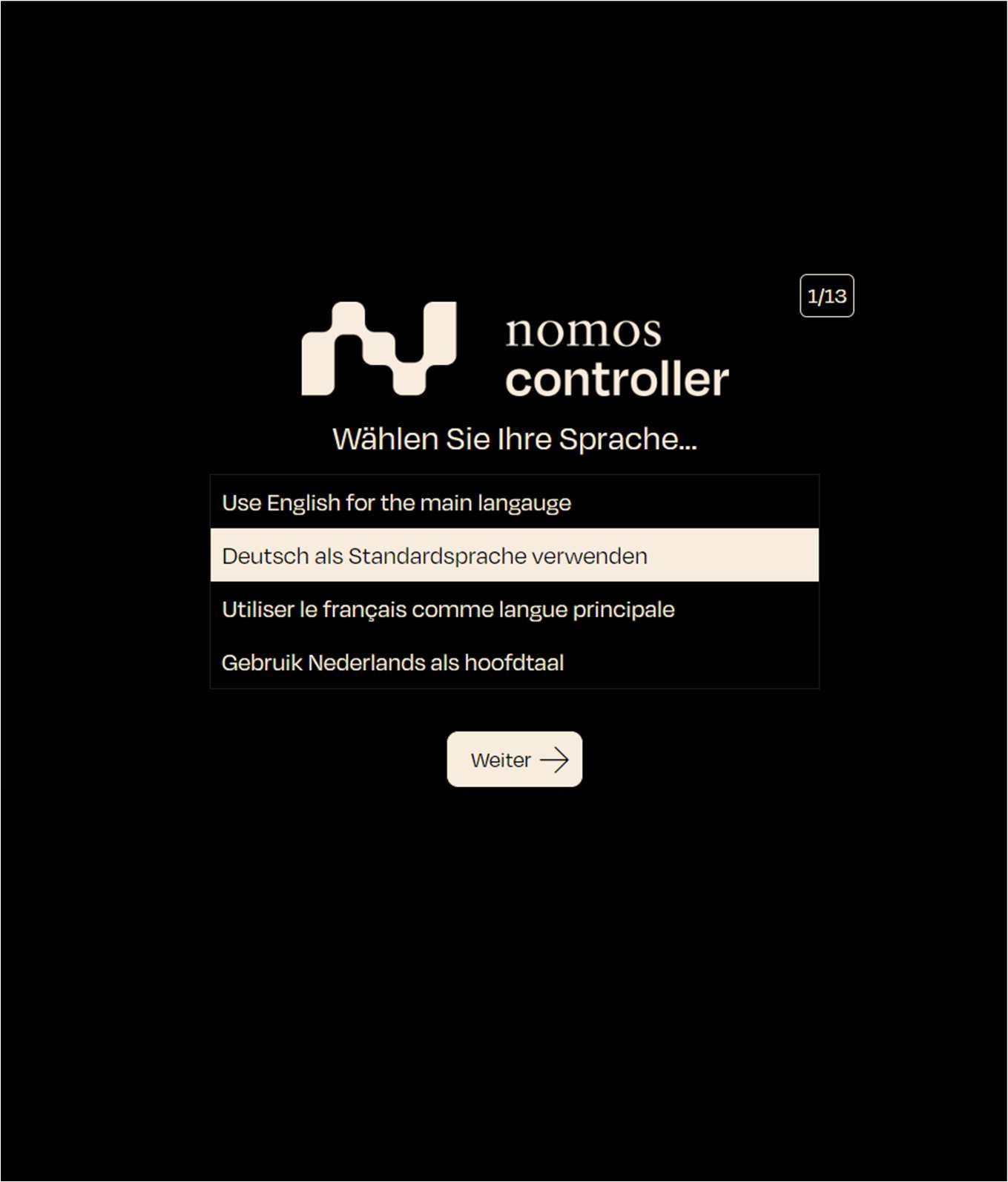 Lors du démarrage du contrôleur nomos, l'utilisateur est invité à choisir la langue souhaitée.
