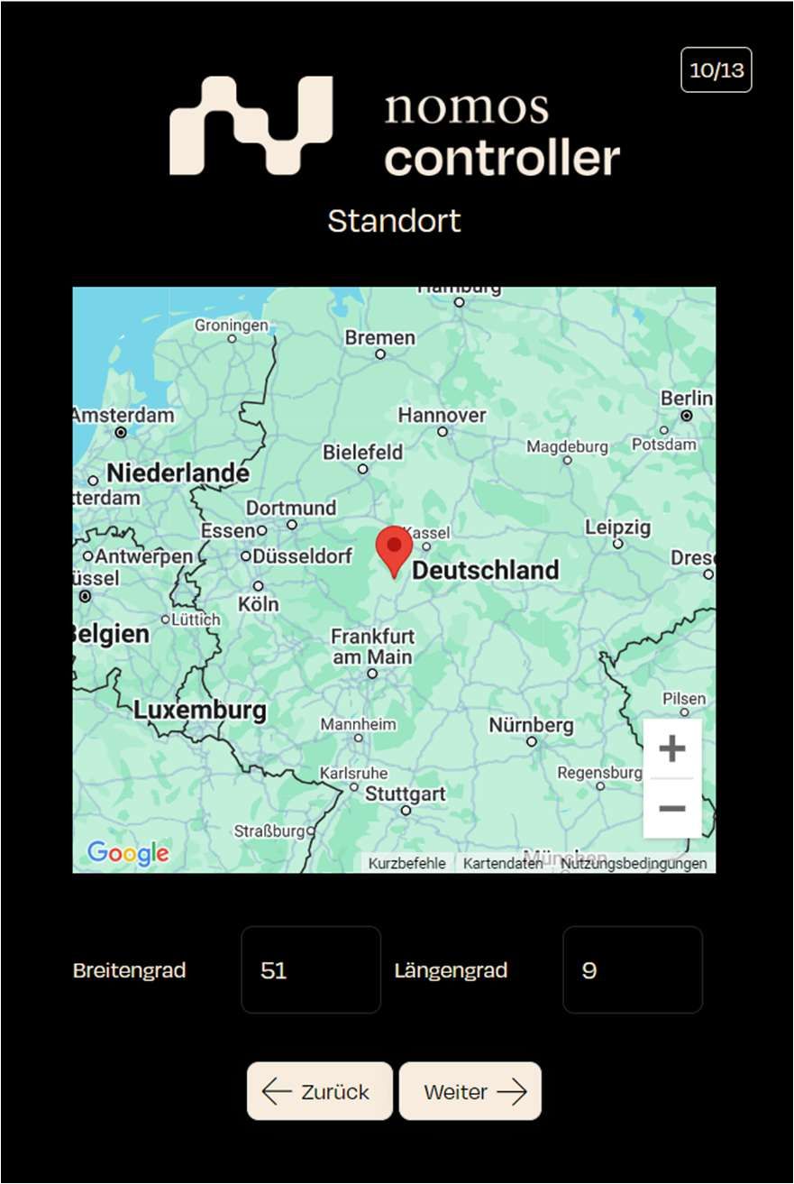 Les informations sur l'emplacement sont utilisées par le contrôleur nomos pour recueillir des données géographiques relatives à votre projet/objet. Par exemple, pour utiliser les heures exactes de lever ou de coucher de soleil pour certains contrôles.