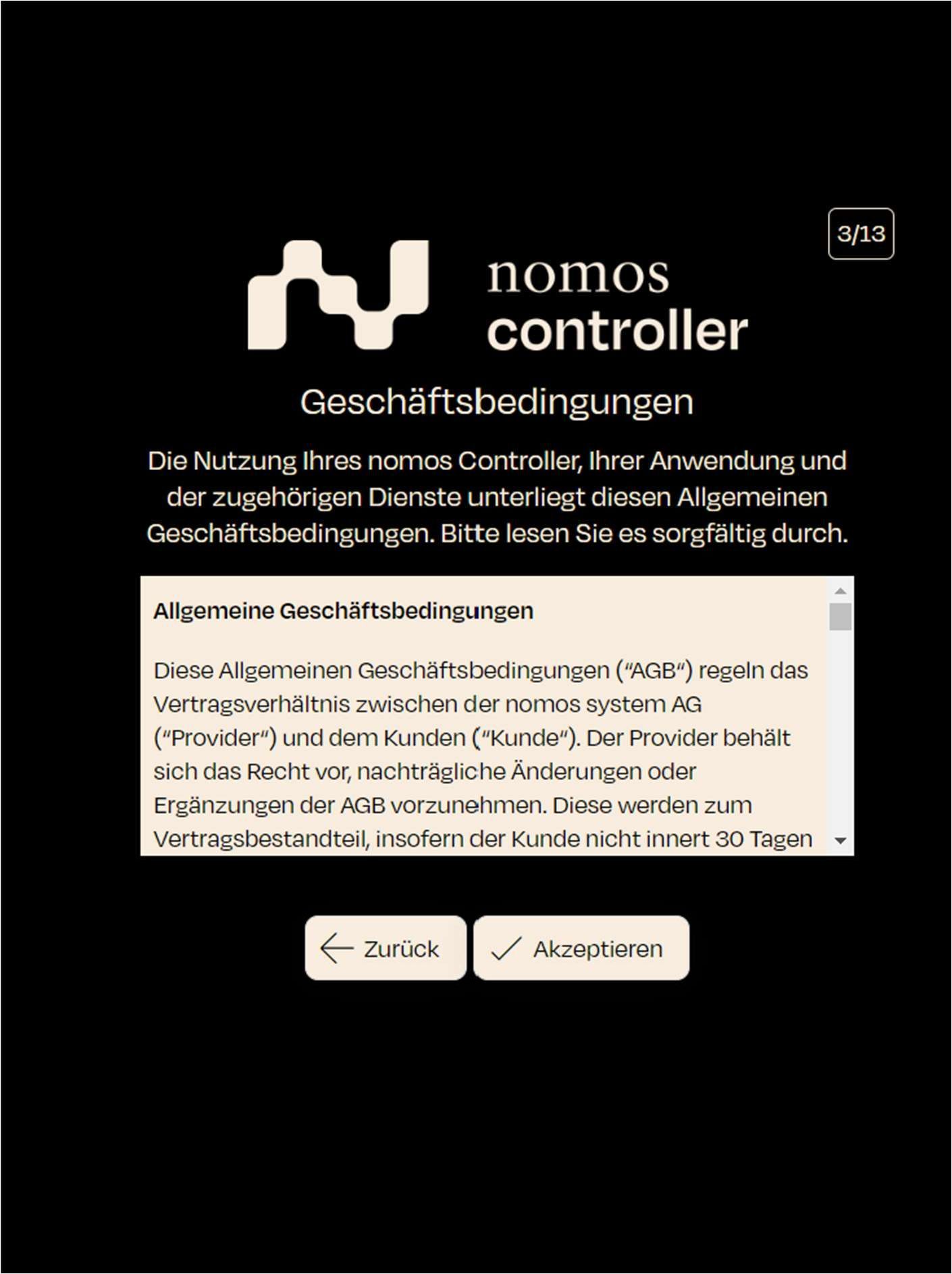 Pour terminer l'installation et la configuration du contrôleur nomos, il est nécessaire d'accepter les conditions générales.