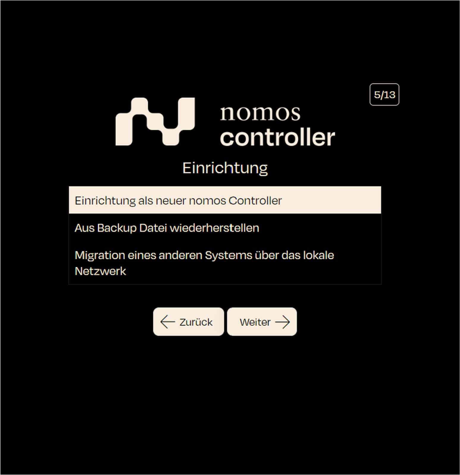 Étape : Choisissez l'option qui correspond à votre situation. Pour une nouvelle installation, choisissez « Installation en tant que nouveau contrôleur nomos ».