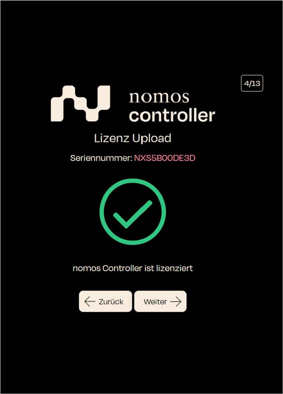 After accepting the terms and conditions, the next step is to license the nomos Controller.