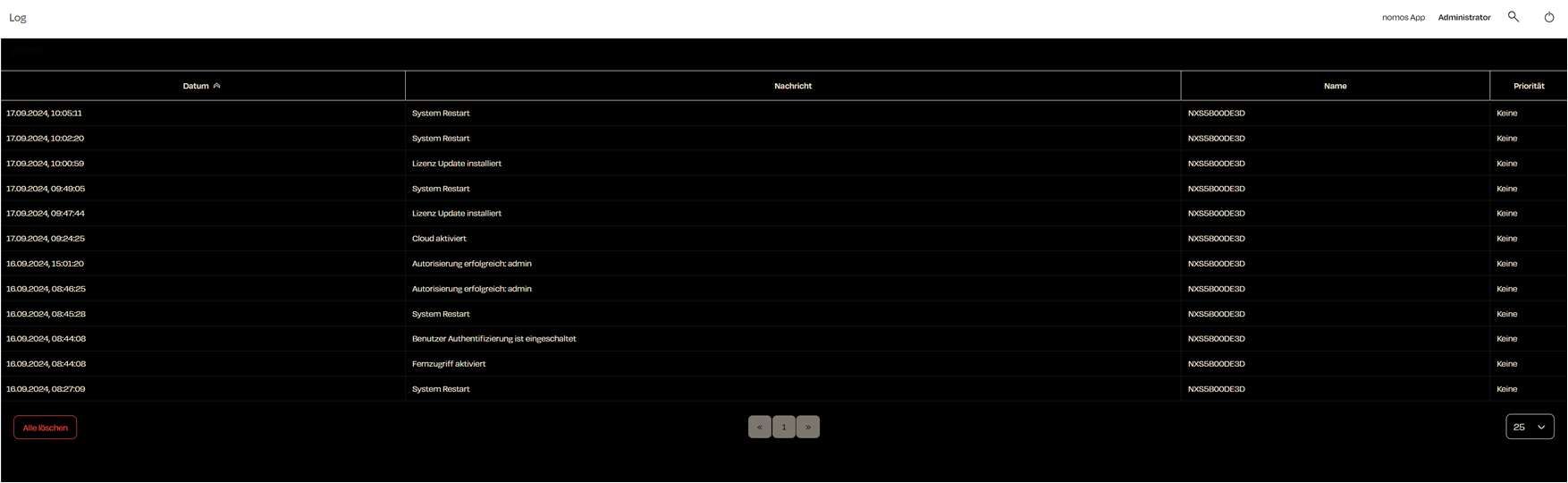 The log management feature in the nomos Controller allows you to monitor all important events, actions, and system processes. This provides an easy way to check the system status, diagnose errors, and track user actions.