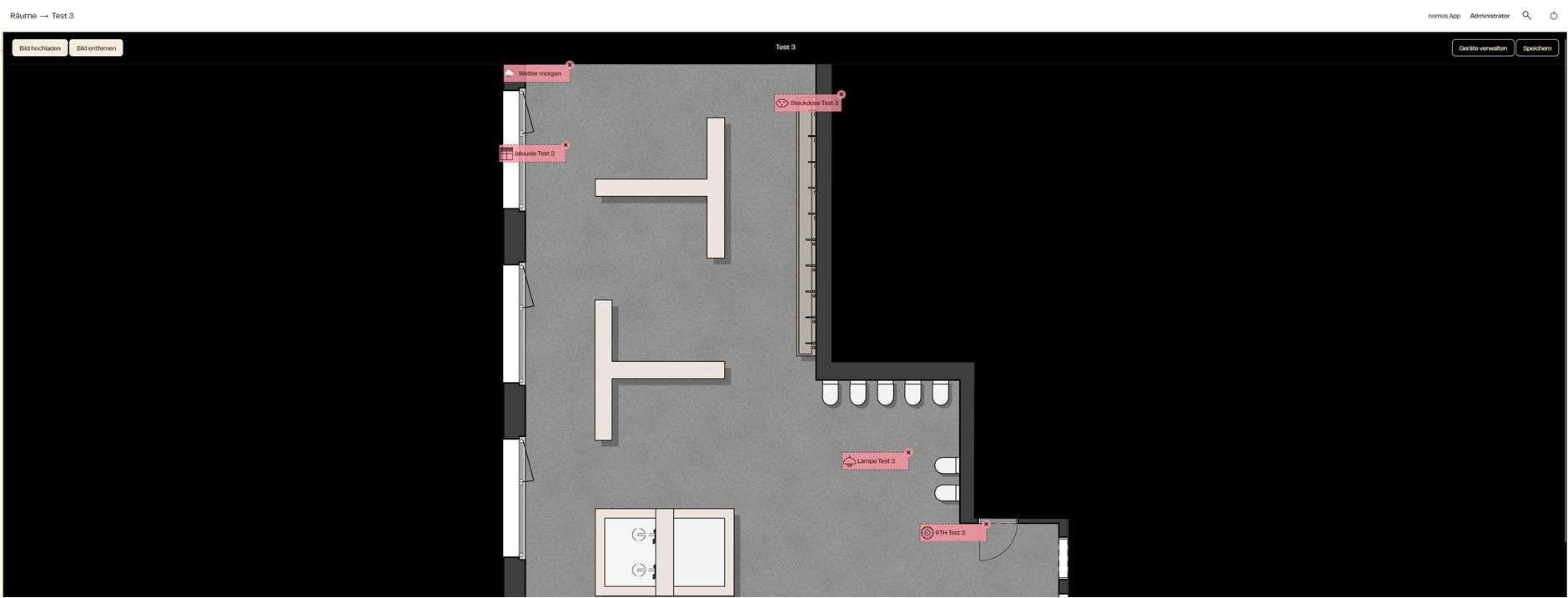 Once the image is uploaded, devices assigned to the room appear as pink fields on the screen. Each of these fields represents a device, such as: