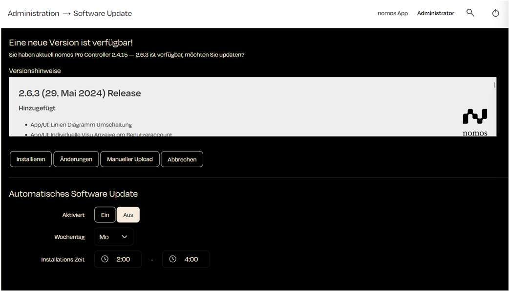 Wanneer er een nieuwe versie van de nomos software beschikbaar is, wordt deze bovenaan weergegeven.