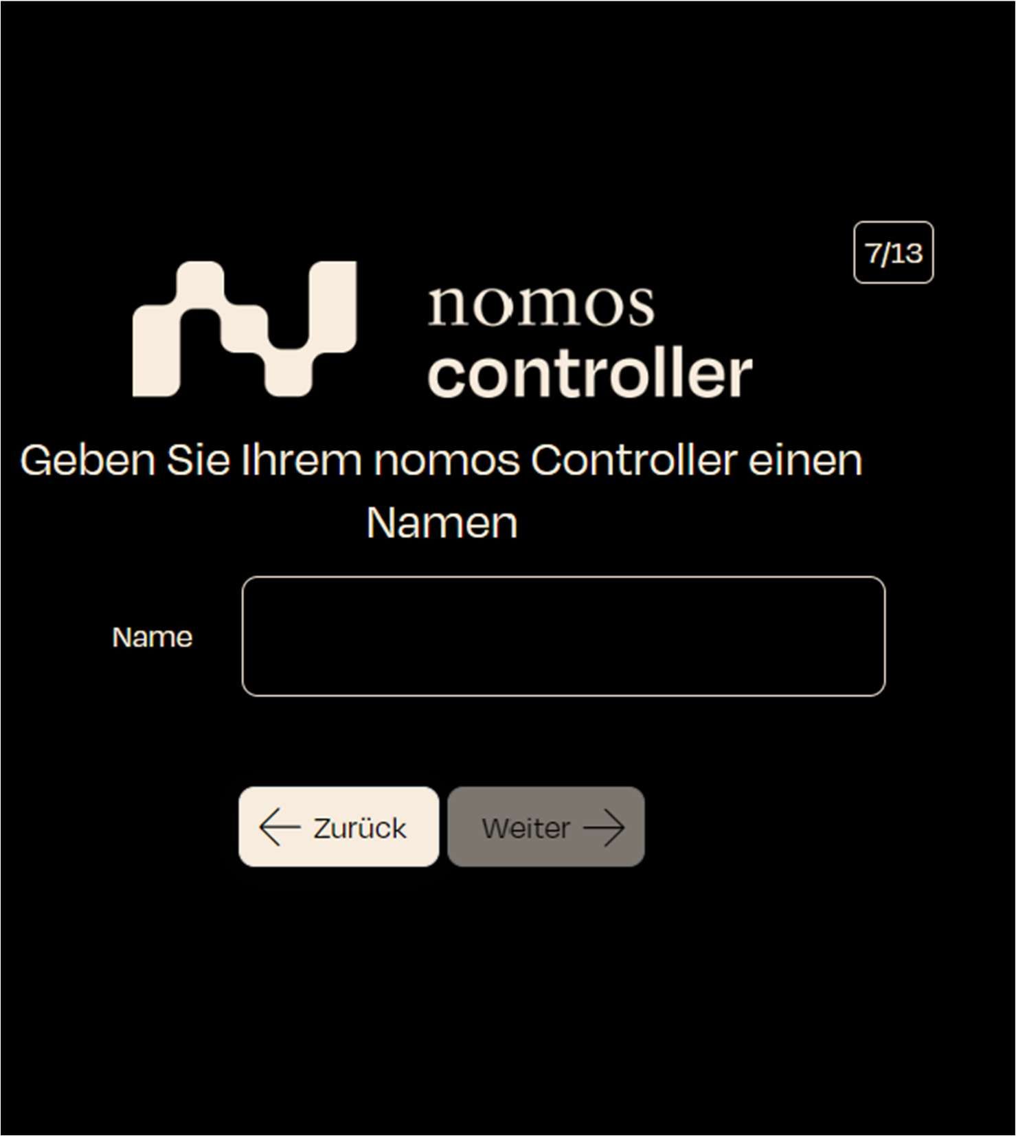 Schermweergave: Er verschijnt een tekstveld waarin de gebruiker een naam voor de nomos controller kan invoeren.