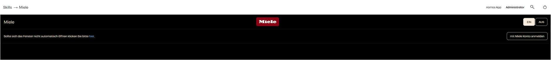 Om uw Miele-apparaten met de nomos system Controller te verbinden, moet u zich aanmelden met uw Miele-account. Klik hiervoor op de knop "met Miele account aanmelden" aan de rechterkant van het scherm.