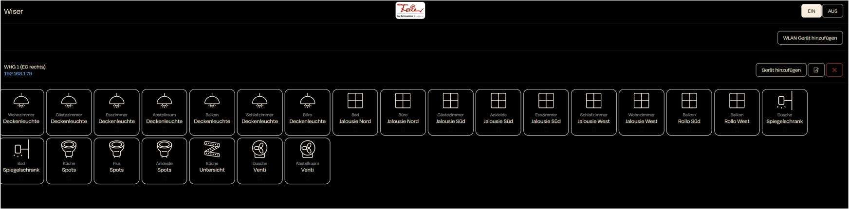 Boven de lijst ziet u het IP-adres van de aangesloten controller die de apparaten aanstuurt. In dit geval 192.168.1.79.