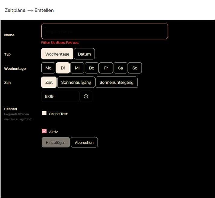 * Het veld **Naam** is verplicht. Hier geeft u het tijdschema een duidelijke naam die de geplande actie beschrijft, bijvoorbeeld "Morgenverlichting" of "Verwarming vanmiddag uitzetten".